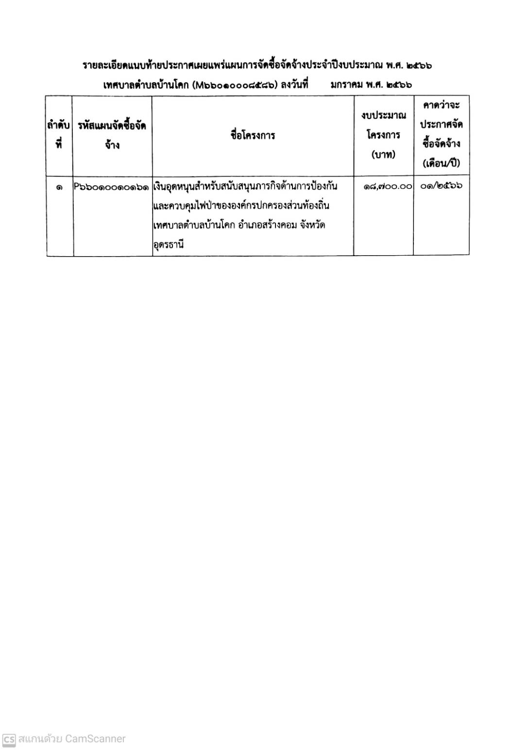 ประกาศเผยแพร่แผนการจัดซื้อจัดจ้าง ประจำปีงบประมาณ พ.ศ. ๒๕๖๖ (เงินอุดหนุนสำหรับสนับสนุนภารกิจด้านการป้องกันและควบคุมไฟป่าขององค์กรปกครองส่วนท้องถิ่น เทศบาลตำบลบ้านโคก อ.สร้างคอม จ.อุดรธานี)