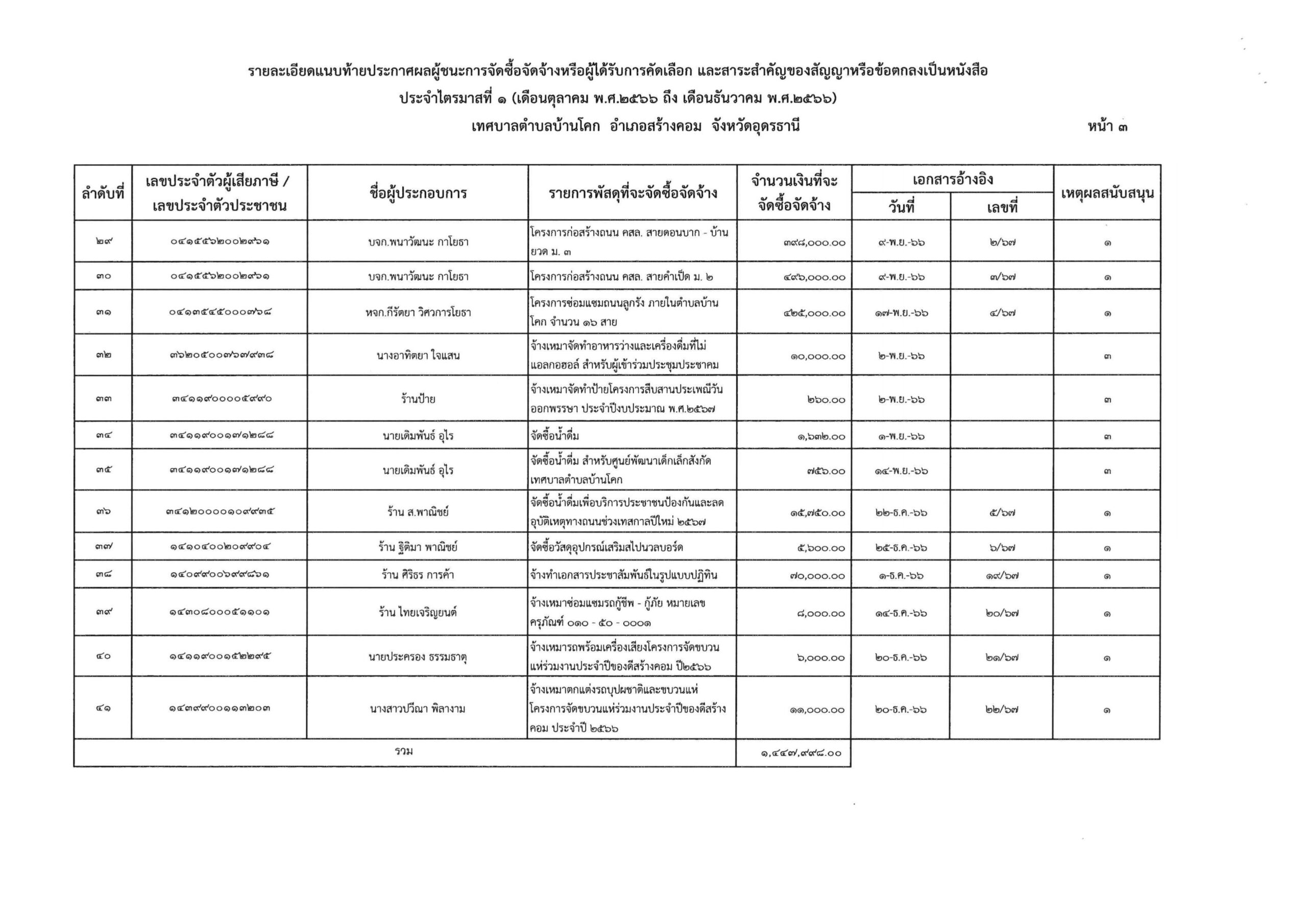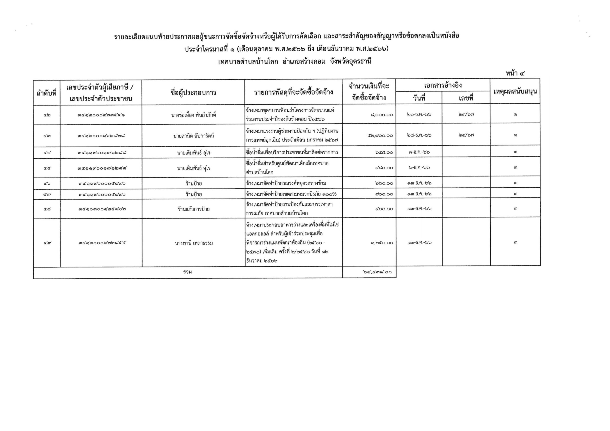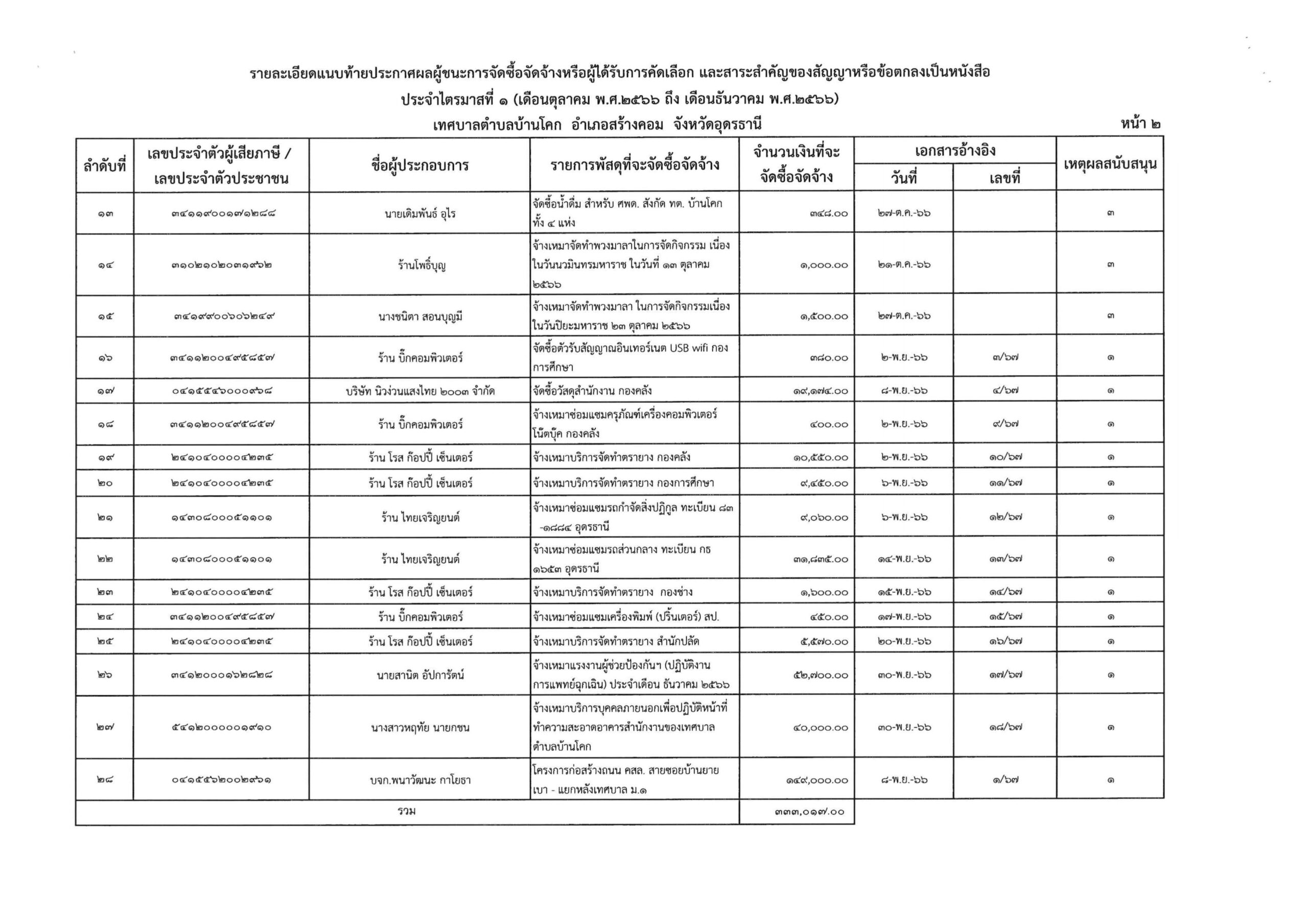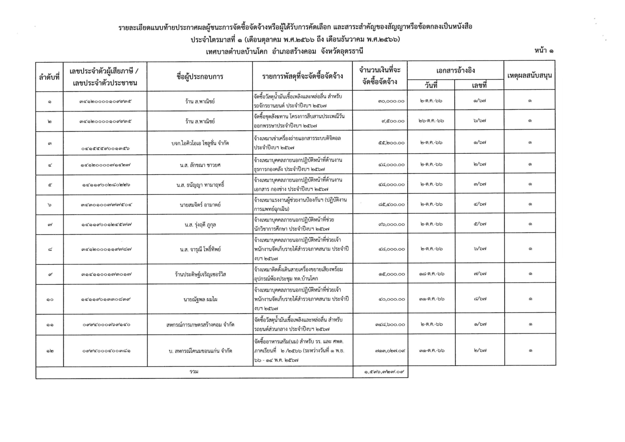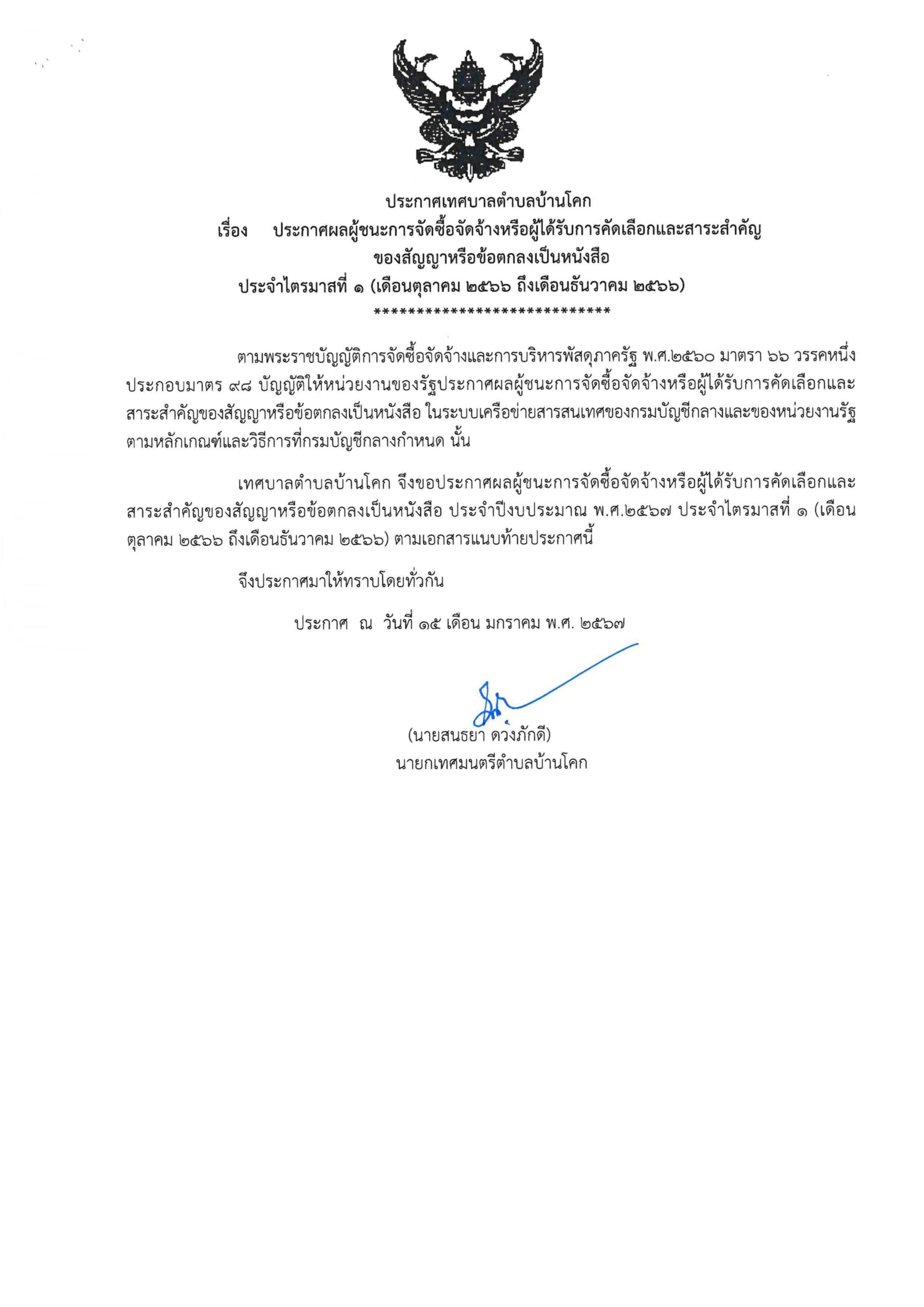 รายงานผลผู้ชนะการจัดซื้อจัดจ้างหรือผู้ที่ได้รับการคัดเลือก และสาระสำคัญของสัญญาหรือข้อตกลงเป็นหนังสือ ประจำไตรมาสที่ ๑ (เดือนตุลาคม ๒๕๖๖ ถึงเดือนธันวาคม ๒๕๖๖)