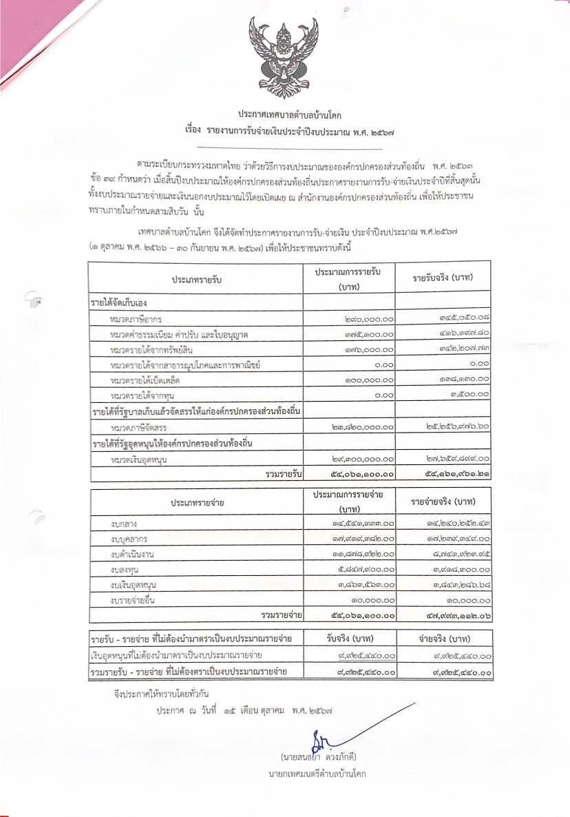 ประกาศเทศบาลตำบลบ้านโคก เรื่องรายงานการรับจ่ายเงินประจำปีงบประมาณ 2567