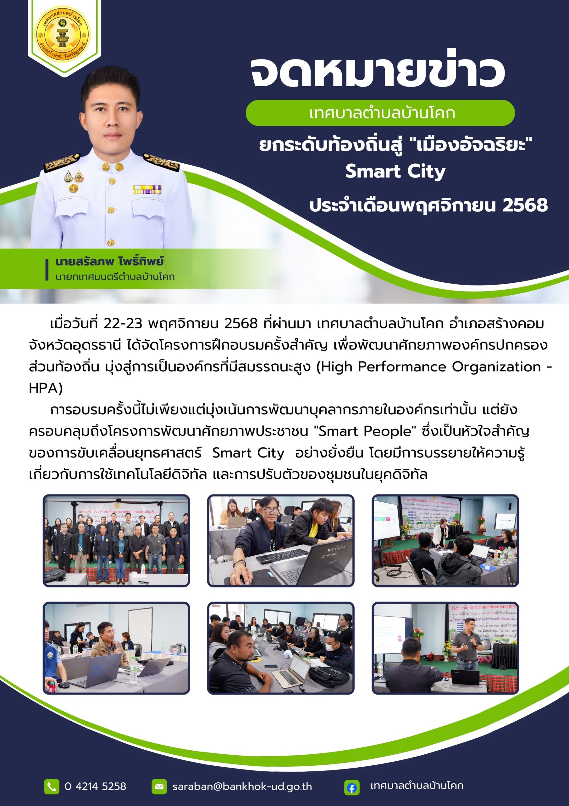 เมื่อวันที่ 22-23 พฤศจิกายน 2568 ที่ผ่านมา เทศบาลตำบลบ้านโคก อำเภอสร้างคอม จังหวัดอุดรธานี ได้จัดโครงการฝึกอบรมครั้งสำคัญ เพื่อพัฒนาศักยภาพองค์กรปกครองส่วนท้องถิ่น มุ่งสู่การเป็นองค์กรที่มีสมรรถนะสูง (High Performance Organization – HPA)